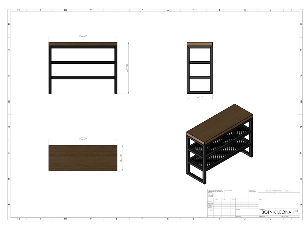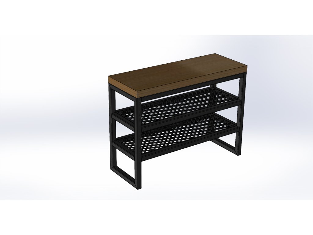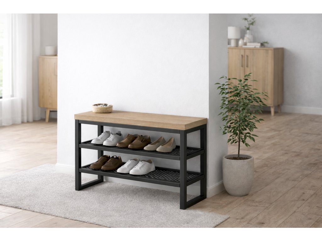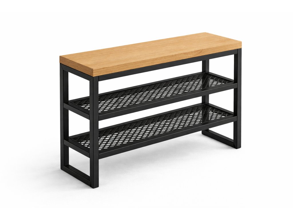 Tento dvoupatrový botník kombinuje praktické úložné řešení s elegantním designem. Horní deska poskytuje pohodlné místo k sezení i k odkládání věcí. Prostor pro obuv je tvořen děrovaným plechem – tahokovem, který zajišťuje dobrou cirkulaci vzduchu a zároveň dodává celému kusu stylový industriální nádech. Botník tak spojuje funkčnost s moderním vzhledem, který oživí každou předsíň.